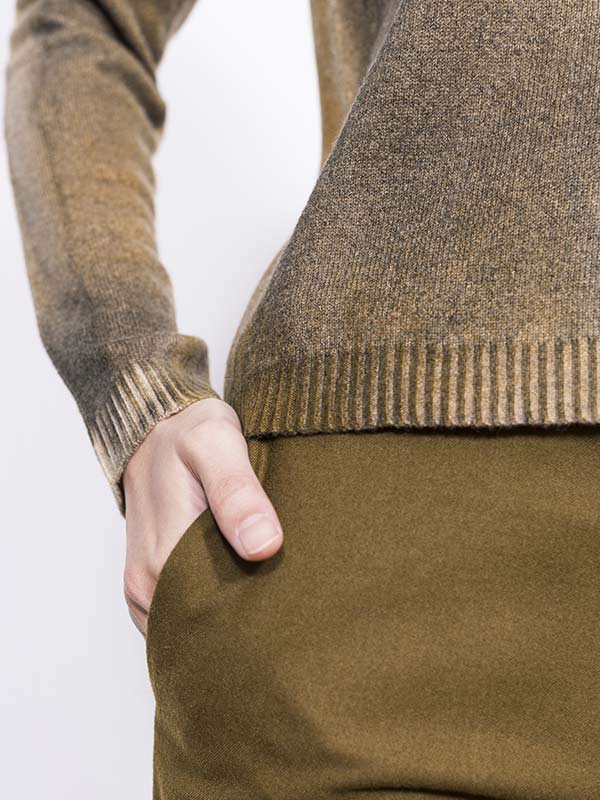 Questo capo è stato tinto a mano individualmente per ottenere un effetto colore unico. Ogni singolo pezzo può risultare diverso uno dall’altro e mostrare alcune irregolarità, segno distintivo di un processo artigianale.