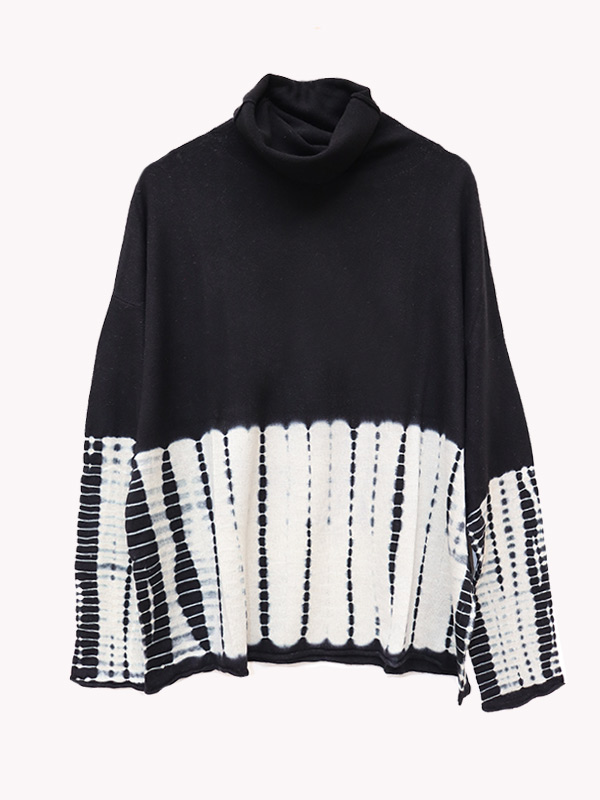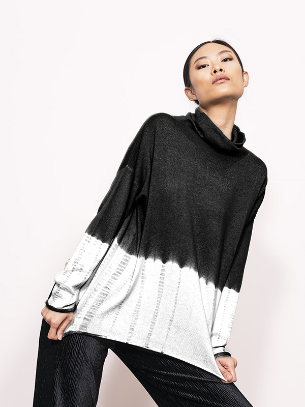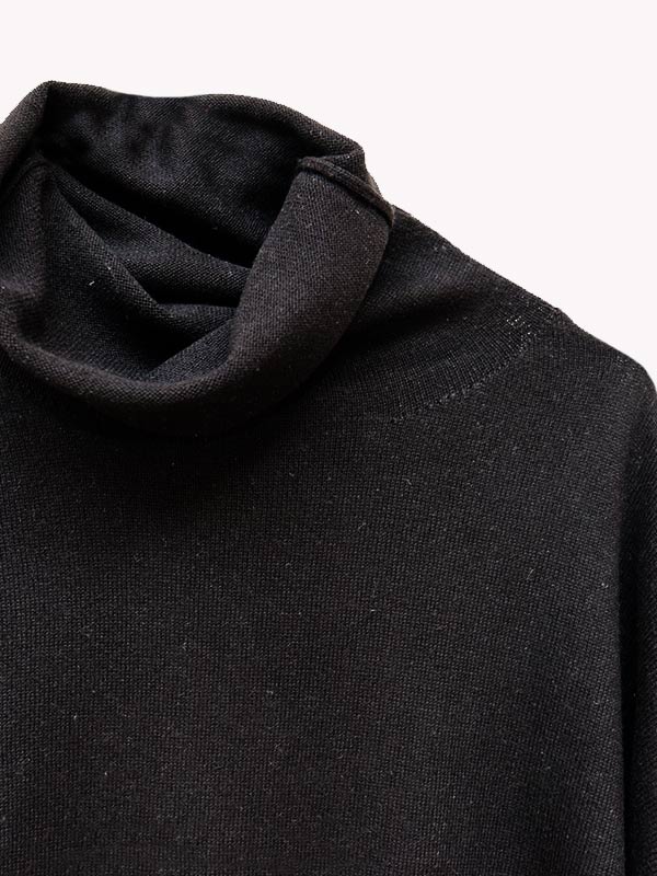 Maglia dolcevita lavorata su finezza 12 con maniche scese e rifiniture in rolotè.