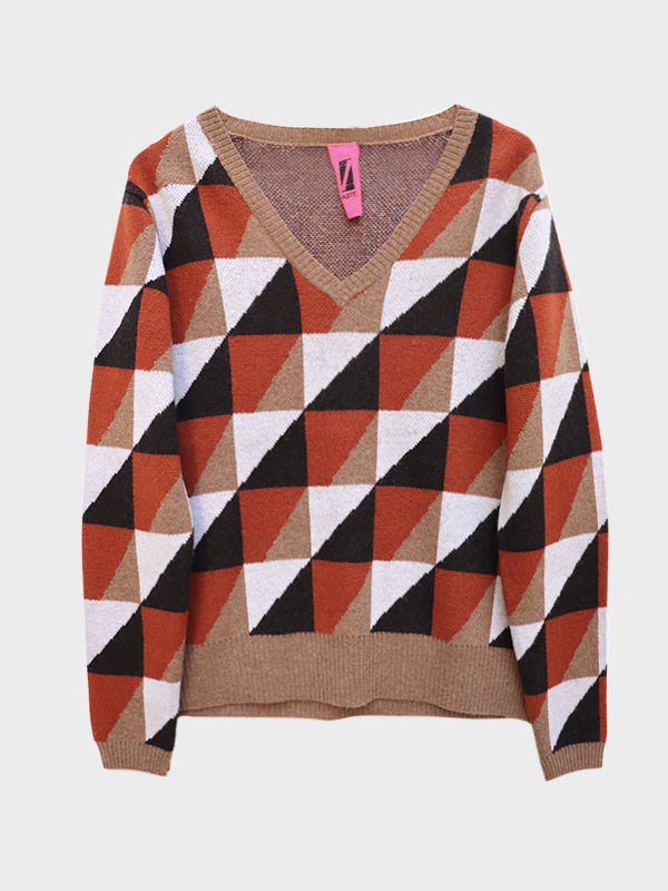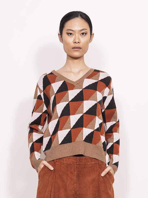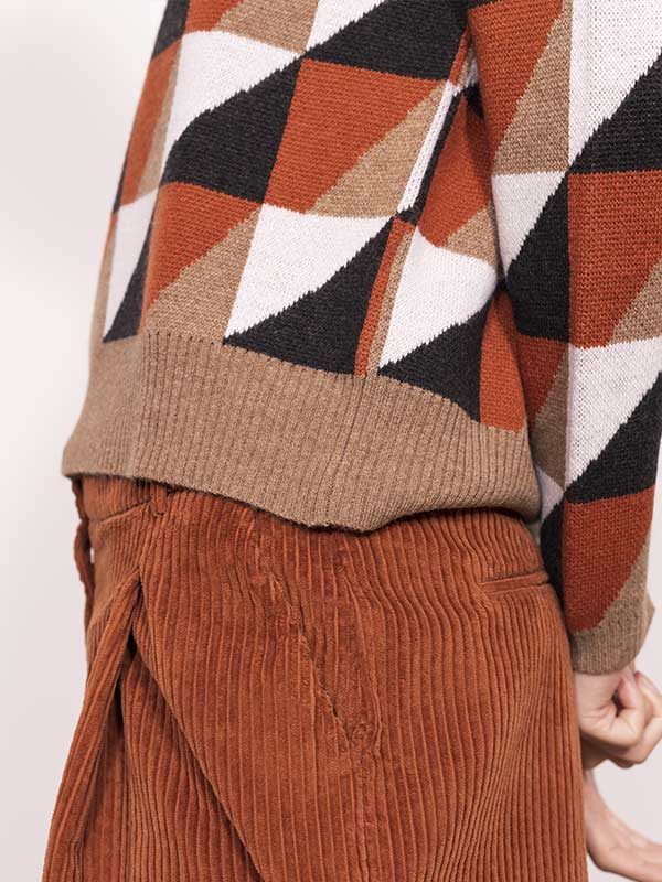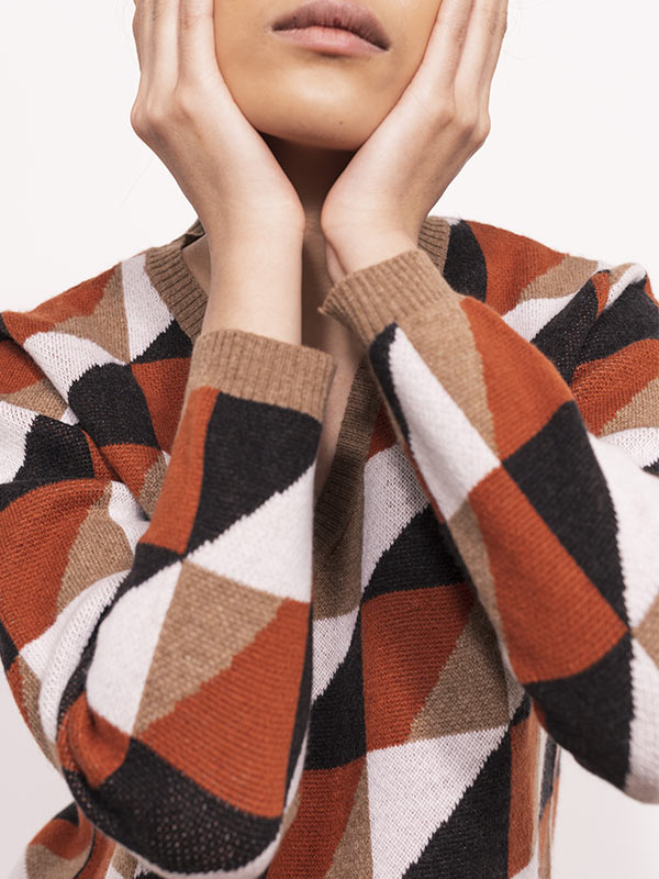 Il disegno block jacquard rinnova lo stile della maglia.
