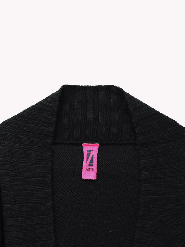 Cardigan a maglia spessa lavorato su finezza 5 a coste larghe e maniche scese.