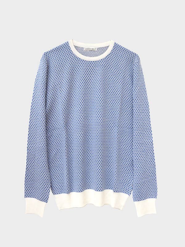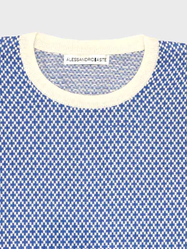 Il disegno jacquard, icona di Alessandro Aste, rinnova lo stile della maglia girocollo.