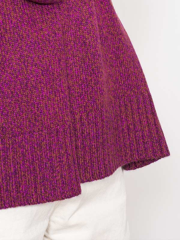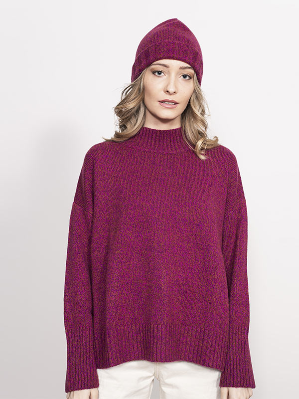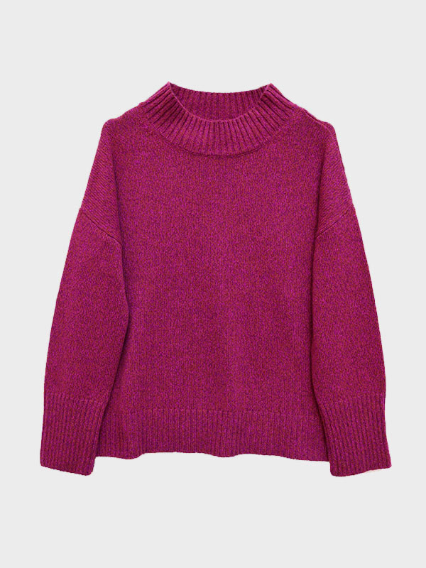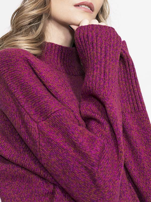 Maglia girocollo spessa lavorata su finezza 5 con maniche scese e rifiniture a costa larga.