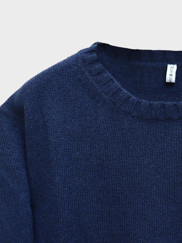 Maglia spessa girocollo lavorata in maglia rasata con coste larghe sul collo e bordi con spacchetti laterale sul fondo.