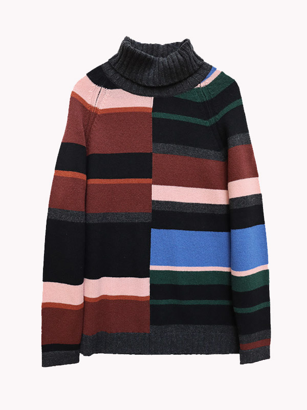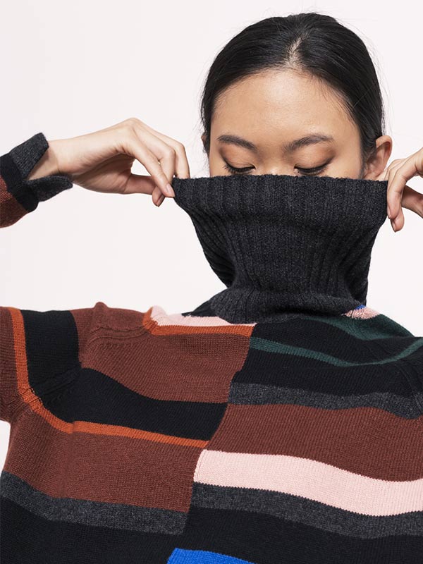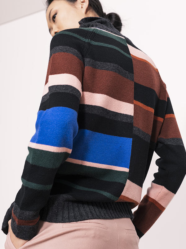 Gli accostamenti di colore della lavorazione multiriga donano un tocco vivace e fresco al capo con i bordi dello scollo, dei polsini e del fondo in contrapposizione.