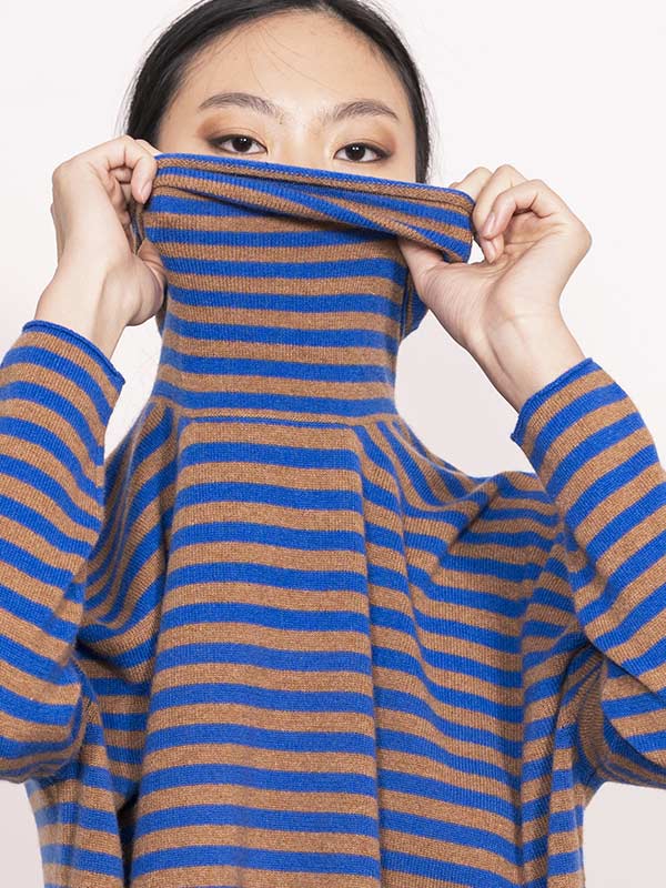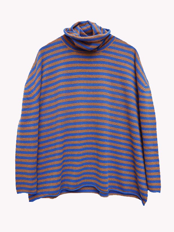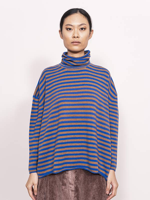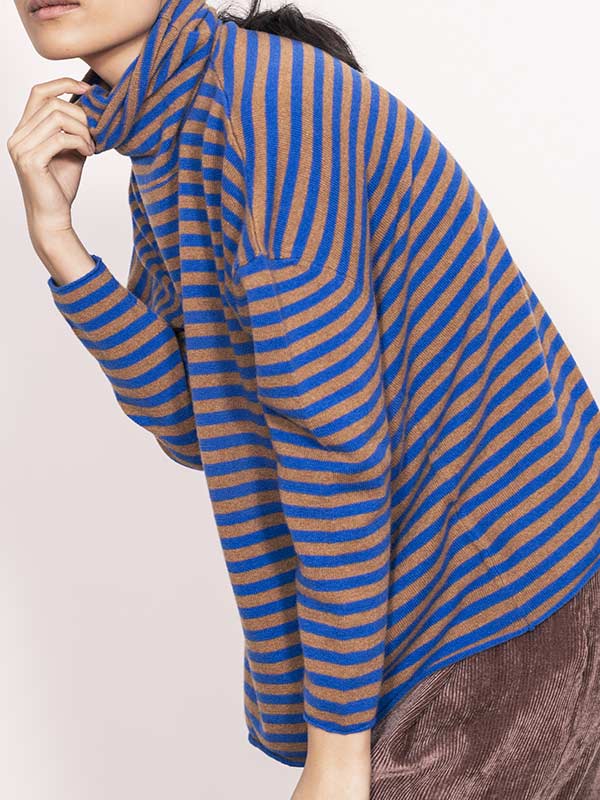 Maglia dolcevita a righe lavorata su finezza 12 con maniche scese e rifiniture in rolotè.