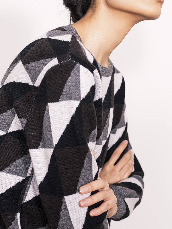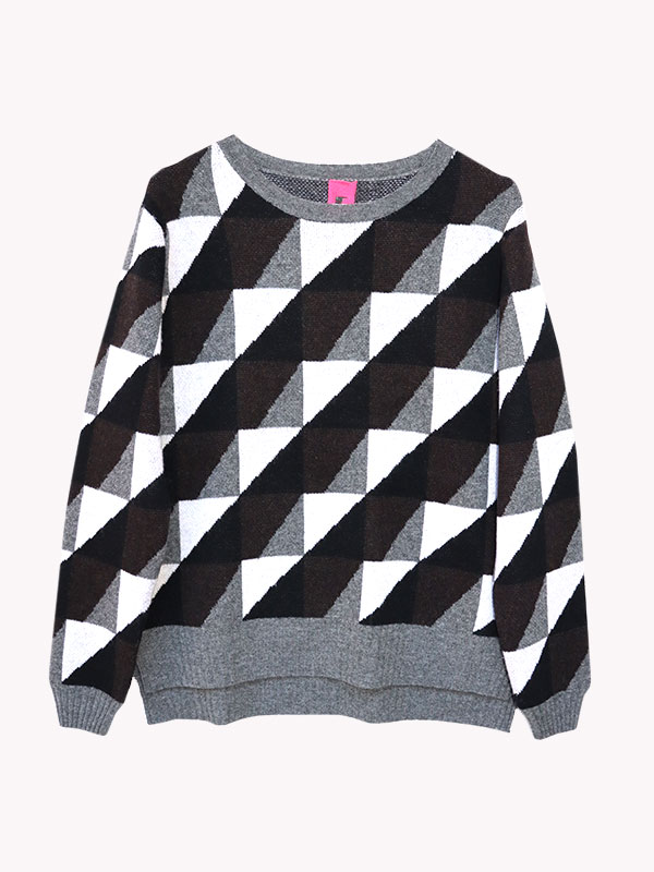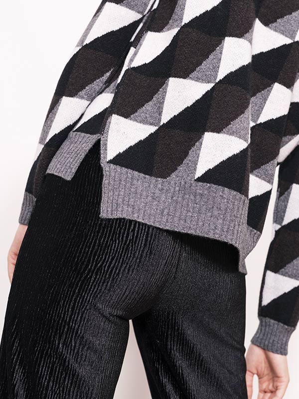 Gli accostamenti di colore della lavorazione bloch jacquard donano un tocco vivace e fresco al capo con i bordi dello scollo, dei polsini e del fondo in contrapposizione.